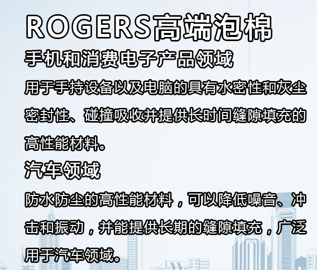 美国罗杰斯公司Rogers( Corporation) 4790-92等系列和日本罗杰斯井上Rogers Inoac (Corporation) 生产的PORON,SRS-40P,CR4305,E4308系列等, 美国罗杰斯公司(Rogers Corporation)生产的BISCO HT-800,BF-1000.